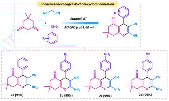 Magnesium nitrate hexahydrate (Mg(OH)2 6H2O) (Spectrochem, Mumbai, India), and aluminum nitrate nonahydrate (Al(NO3)3 9H2O) and 28% ammonium hydroxide solutions were purchased from Merck, Bengaluru, India. Phosphoric acid (H3PO4) was purchased from TCI Chemicals, India. Benzaldehyde was purchased from Spectrochem, India, Furfural was purchased from Sigma-Aldrich (St. Louis, MO, USA), and 4-chlorobenzaldehyde and 4-bromobenzaldehyde were purchased from Merck, India. Dimedone and malononitrile were purchased from Sigma-Aldrich (USA). Of the solvents, ethanol was purchased from Bengal Chemicals (Kolkata, India); acetone and methanol were purchased from Finar Chemicals (Mumbai, India); and the NMR solvent CDCl3 was purchased from Sigma-Aldrich (USA). All the reagents and solvents were used without any further purification.