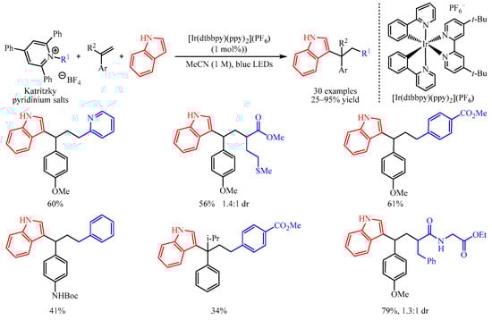 In 2019, Glorius and co-workers [16] disclosed an elegant method of the 1,2-dicarbofunctionalization of aryl alkenes with Katritzky pyridinium salts as the radical precursors and electron-rich indoles as the coupling partners. With a catalytic amount of [Ir(dtbbpy)(ppy)2](PF6), a number of densely functionalized 1,1-diarylalkanes could be obtained in 25–95% yields (Scheme 1). Notably, pyridine-containing products, thioether-functionalized products, ester-containing products, Boc-protected amino-functionalized products and all-carbon quarternary centers are successfully produced in this system. Dipeptide-derived Katritzky pyridinium salt is also amenable in this transformation. Further, mechanistic studies suggest that the reaction began with the reduction of Katritzky salt by excited photocatalyst to afford the corresponding radical, which was captured by the aryl alkenes to give the arylmethyl radical intermediate. This intermediate could be oxidized to produce an arylmethyl carbocation intermediate, which was trapped by the nucleophilic aromatic compound to furnish the target product.
