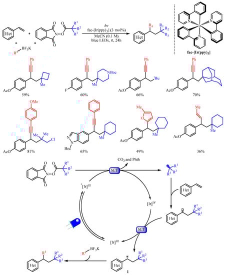 Subsequently, the Molander group [17] adopted another kind of radical progenitor alkyl N-(acyloxy)phthalimide ester to trigger the 1,2-dicarbofunctionalization of electron-rich aryl and heteraryl substituted olefins with organotrifluoroborates as the carbon-centered nucleophiles (Scheme 2). This protocol provides a robust implement for the carbo-alkynylation, -arylation, -allylation, or -alkenylation of alkenes by simply altering the structure of organotrifluoroborates. The author suggested that this reaction proceeds through photochemical radical/polar oxidation to afford a key carbocation species 1 with the extrusion of carbon dioxide and Phth from alkyl N-(acyloxy)phthalimide esters. This carbocation species then underwent subsequent coupling with organoboron nucleophiles to produce the desired product. Notably, the strained cyclobutane subunit, the Boc-protected amine, halogens, heterocyclic moiety, the bridged bicycle and acyclic moieties were all tolerated in this reaction. Furthermore, a substrate derived from estrone was also viable and delivering the corresponding steroid derivative in good yield [18].