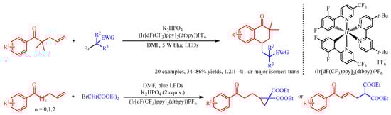 Recently, Huang and co-workers [19] addressed the (Ir[dF(CF3)ppy]2(dtbpy))PF6 catalyzed difunctionalization of alkenyl ketones for the synthesis of tetralones and cyclopropane compounds with α-carbonyl alkyl bromide as the radical source (Scheme 3). With the irradiation of visible light, the Ir complex could promote the reduction of α-carbonyl alkyl bromides to deliver the corresponding radical species. Subsequently, this radical was trapped by the alkenyl group of the substrate to produce the secondary alkyl radical intermediate, which preceded a further cyclization process to obtain the product. Interestingly, with gem-dimethyl substituted alkenes as the substrate, intramolecular cyclization occurred between the aryl group and secondary alkyl radical section, followed by oxidization with the Ir-complex to afford the six-membered cyclic product tetralones. However, when β,γ-unsaturated arylketones were introduced, the cyclopropane derivatives could be achieved through the loss of a proton and intramolecular three-membered cyclization.