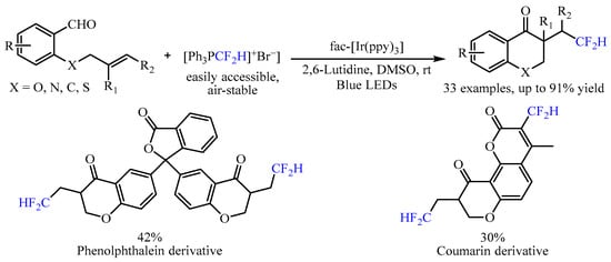 In 2022, Mao and co-workers [20] developed another radical progenitor [Ph3PCF2H]+Br−triggered, visible light-mediated tandem difluoromethylation/cyclization reaction with alkenyl aldehydes as the starting material (Scheme 4). By utilizing fac-Ir(ppy)3 as the catalyst, a range of CF2H-substituted chroman-4-one skeletons could be achieved in moderate to good yields, and good chemoselectivity under mild reaction conditions. In this transformation, the fac-Ir(ppy)3 could be activated to generate the excited-state fac-IrIII(ppy)3* under irradiation with a 5 W blue LED, which then reduced [Ph3PCF2H]+Br− to produce the vital •CF2H radical through a single-electron transfer (SET) process to promote the further intramolecular cyclization. In addition, substrates derived from phenolphthalein and coumarin were also viable, generating the corresponding products in good yields.