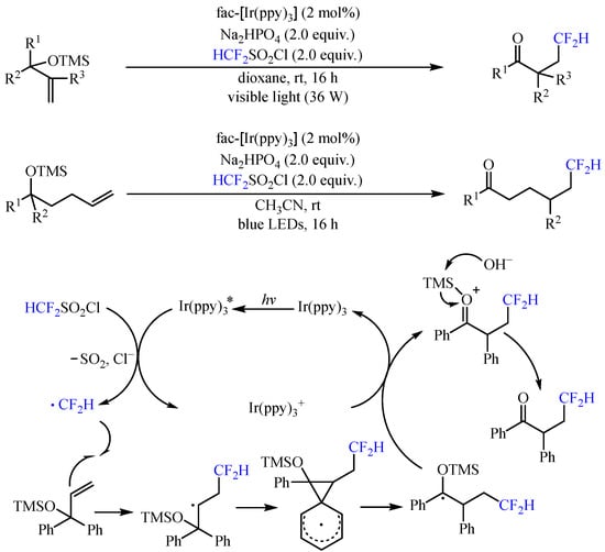 With the same catalyst, Dolbier and co-workers [21] realized the photoredox-catalyzed addition of difluoromethyl radical to trimethylsilyloxy-substituted alkenes, allowing the construction of a diverse series of difluoromethyl ketones via neophyl-like aryl and heteroaryl migrations (Scheme 5). With the irradiation of 390–780 nm LEDs, both 1,2- and 1,4-functional group migrations could be achieved, delivering the corresponding product with 32–96% yields. The reaction was initiated by the photoexcited fac-Ir(ppy)3 catalyst to reduce CF2HSO2Cl via SET with the release of chloride and SO2, generating the vital •CF2H radical. This radical was then captured by the alkenyl group and further underwent aryl ipso-migration to deliver an arylmethyl radical, which was subsequently oxidized by the high-valent Ir catalyst and underwent the loss of the trimethylsilyl group to furnish the final product.