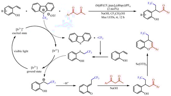 The CF3 group is one of the most important functional groups for drug research, and numerous efforts have been devoted to the incorporation of this group into specific molecules [22]. In this regard, Kim et al. [23] developed a (Ir[dF(CF3)ppy]2(dtbpy))PF6-catalzyed functionalization of 2-vinylphenols with 1,3-diketones as the coupling partner and the famous Umemoto’s reagent as the trifluoromethylating reagent (Scheme 6). This reaction resulted in the capture of in situ-generated trifluoromethylated ortho-quinone methides from 2-vinyl phenols, followed by conjugate addition and deacetylation. With 2,2,2-trifluoroethanol (TFE) as the solvent, a variety of γ-trifluoromethylated ketones could be generated in 51–92% yields under the irradiation of 5 W blue LEDs (λmax = 455 nm). In addition, the trifluoromethylated ketone products could be successfully cyclized to 4-(2,2,2-trifluoroethyl)-4H-chromenes in good yields with an equivalent amount of Sc(OTf)3.