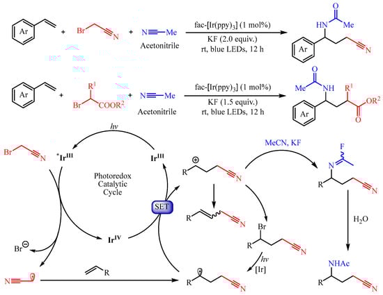 In 2022, Chen’s group [24] developed a visible light-induced fac-Ir(ppy)3, catalyzed three-component Ritter reaction with alkenes, nitriles, and α-bromo nitriles/esters as the substrates, delivering various structurally diverse γ-amino nitriles/acids (Scheme 7). The authors disclosed that the acetonitrile radical or ester group-containing radical could be generated through the metalla-photoredox catalyst fac-Ir(ppy)3-promoted SET process from α-bromo nitriles or α-bromoesters, respectively. Importantly, the introduction of KF is critical for the generation of the acetimidoyl fluoride intermediate, which undergoes the Ritter reaction, thus delivering the amino-alkylation product.