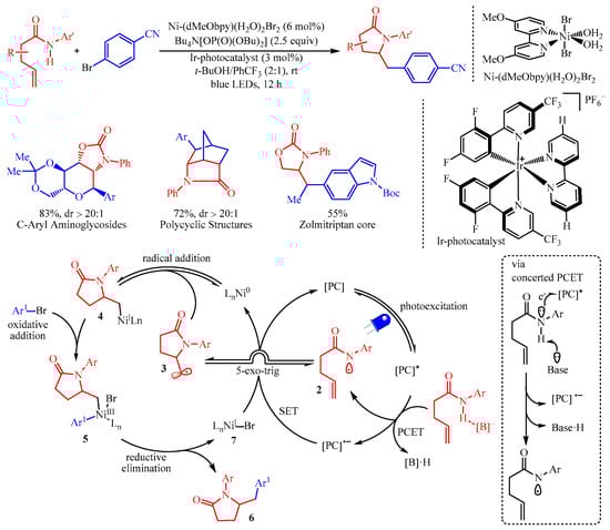 Molander’s group [25] reported the amidoarylation of the amide group containing alkenes by merging photoredox proton-coupled electron transfer (PCET) with nickel catalysis for the synthesis of five-membered heterocyclics with aryl halides (Scheme 8). In this protocol, the [Ir-photocatalyst] (3 mol%) was utilized as the photocatalyst and Ni-(dMeObpy)(H2O)2Br2 (6 mol%) was the catalyst for the radical-mediated coupling process. This strategy has granted access to an array of complicated molecules bearing a pyrrolidinone core from readily available alkenyl amides and aryl- or heteroaryl-halides. Additionally, this transformation is not limited to amides, as carbamates and ureas were also viable. Disappointingly, the reaction failed for substrates bearing protic functional groups. Mechanistic studies, including hydrogen-bond affinity constants, control experiments and cyclic voltammetry studies, have confirmed that the reaction followed a proton-coupled electron transfer (PCET) procedure. Initially, the formation of an amidyl radical 2 via PCET occurred, which was followed by fast 5-exo-trig cyclization to generate the alkyl radical 3. Subsequently, combination with the nickel catalyst formed a Ni(I)-complex 4, which underwent oxidative addition with aryl halides, resulting in the Ni-intermediate 5. The reductive elimination of 5 generated the desired product 6 and the Ni(I)-halide complex 7 to facilitate the next catalytic cycle.