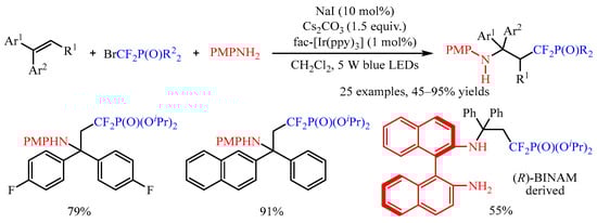 Bromodifluoromethanephosphonates represents another kind of difluoromethylation reagent, and the use of such reagents could not only introduce the CF2 group, but also introduced a phosphate functional group [26]. The photocatalyzed intermolecular aminodifluoromethylphosphonation of aryl alkenes was successfully developed by Yang’s group [27] for the synthesis of α,α-difluoro-γ-aminophosphonates (Scheme 9). In this protocol, fac-[Ir(ppy)3] was employed as the photocatalyst and arylamines as the nucleophilic reagent. The diethyl or diisopropyl bromodifluoromethylphosphate was tolerated in this transformation; however, (bromodifluoromethyl)diphenylphosphine oxide failed to give the desired product. Moreover, this reaction could be applied to the modification of complex chiral arylamines, such as (R)-BINAM ((R)-(+)-2,2′-diamino-1,1′-binaphthalene).
