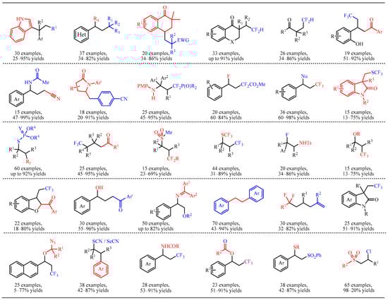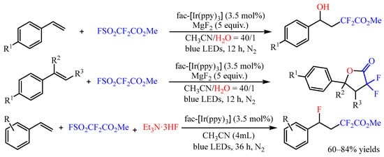 α-Difluoroacetates is a class of efficient difluoroacetylation reagent, and it could also be introduced to the difunctionalization of alkenes [28]. In 2022, Xi’s group [29] developed the photoredox-catalyzed hydroxydifluoroacetylation of aryl alkenes with FSO2CF2CO2Me and H2O as the coupling partners (Scheme 10). The -CF2CO2Me and -OH groups could be simultaneously introduced into the molecules with fac-[Ir(ppy)3] as the photocatalyst in good to high yields with high regioselectivity. Interestingly, when disubstituted alkenes were used in the reaction, the difluorolactone compound was only isolated after a general work-up due to the congestion effect of the substituents. Subsequently, the same group disclosed the fluorodifluoroacetylation of aromatic alkenes with this difluoroacetylation reagent. In this reaction, the Et3N·3HF was introduced as the nucleophilic reagent, and an array of γ-functionalized difluoroacetates could be obtained with 60–84% yields [30].