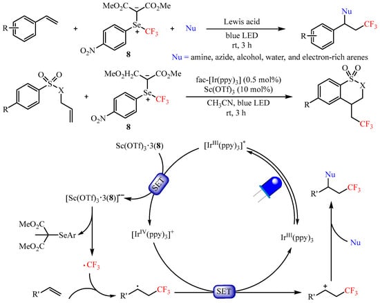 In 2020, Shen’s group [31] developed a reactive electrophilic selenium ylide-based trifluoromethylating reagent and realized the difunctionalization of aryl alkenes using an array of nucleophiles, such as amines, azides, alcohols, water, as well as electron-rich arenes. The Lewis acid Sc(OTf)3 and photoredox catalyst fac-Ir(ppy)3 were selected for use in the synergistic catalyst system to promote the 1,2-difunctionalization of olefins, providing a unified route to functionalized trifluoromethylated compounds with good to excellent yields (Scheme 11). Mechanistic studies have demonstrated that the Lewis acid Sc(OTf)3 could activate this trifluoromethylating process via generating the complex Sc(OTf)3•3(8) through Lewis acid–Lewis base interaction. It is worth mentioning that the radical addition/cyclization sequence occurred smoothly when tosyl-protected allylamine was used as the substrate [32].