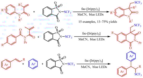Recently, trifluoromethylthiomoiety (SCF3) has attracted increasing attention due to its high Hansch’s hydrophobicity parameter, and numerous methods for its preparation have been described in the literature [33]. As regards the difunctionalization of olefins, Magnier and co-workers [34] accomplished the carbotrifluoromethylthiolation of acrylamides or aryl alkenes with N-trifluoromethylthiosaccharin as the source of the SCF3 radical (Scheme 12). With fac-[Ir(ppy)3] as the photocatalyst, a series of N-aryl acrylamides andstyrenes could be difunctionalized in both an intramolecular and an intermolecular manner, providing the corresponding products in good to excellent yields. Additionally, the author demonstrated that the vital •SCF3 radical was generated by the photoexcited Ir-catalyzed reduction of N-trifluoromethylthiosaccharin through spin trapping/electron paramagnetic resonance (ST/EPR) experiments.