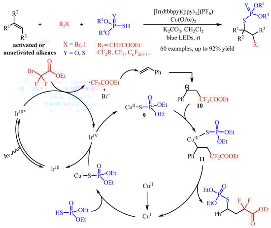 In 2021, Zhang and co-workers [35] developed a synergistic photoredox and Cu(II)-catalyzed fluoroalkylphosphorothiolation of inactivated alkenes via a radical process. In this catalysis, the fluoroalkyl halides (RfX) was introduced as the radical precursor, and the phosphorus compound P(O)SH or P(S)SH was selected as the coupling partner (Scheme 13). A wide range of S-alkyl phosphorothioates and phosphorodithioates bearing β-monofluoroalkyl, -difluoroalkyl, -trifluoromethyl, or -perfluoroalkyl substitutes could be easily fabricated with good yields and moderated to good diastereoselectivity. Importantly, this transformation could be applied to the late-stage functionalization of bioactive molecules [36]. Through mechanistic studies, the authors proposed a possible mechanism. Firstly, the catalyst IrIII could be excited to generate the IrIII* with blue light irradiation, and this highly active species reduces BrCF2COOEt to produce an ethyl difluoroacetate radical through the SET process. Then, the in situ-formed ethyl difluoroacetate radical is captured by the C=C bond of styrene, generating the alkyl radical intermediate. Simultaneously, the phosphorothiolation compound (EtO)2P(O)SH reacts with the Cu(II)-catalyst, yielding the corresponding active (EtO)2P(O)S-Cu(I) intermediate, which further produces a (EtO)2P(O)S-Cu(II) complex 9 via oxidation with the high-valent Ir(IV) species, releasing the iridium (Ir) to finish the photo-redox cycle. This complex 9 can cooperate with alkyl radical 10 to produce a Cu(III) species 11, which undergoes reductive elimination to regenerate the Cu(I) species to close the Cu-catalysis cycle.