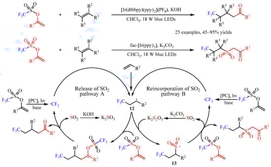 In the same year, Glorius’ group [37] developed an elegant [Ir(dtbbpy)(ppy)2](PF6)-catalyzed difunctionalization of alkenes via a base-controlled reincorporation/release of SO2 strategy (Scheme 14). With this chemo-divergent strategy, various valuable γ-trifluoromethylated ketones and trifluoromethylated sulfonyl ketones could be constructed from the same starting materials. This catalysis exhibited high chemoselectivity with a broad substrate scope. Simple alkenes, such as propene, ethylene, 1-hexene, decene and allylcyclohexane, were amenable. Multi-substituted alkenes, including 1,2-disubstituted, α-methyl substituted, trisubstituted, and tetrasubstituted alkenes, were proved as suitable substrates. Various functional groups including ester, ether, ketone, succinimide, phosphate ester, and polyfluoroalkyl groups are well tolerated. Notably, this protocol could be scaled up and applied in the construction of complicated molecules. Furthermore, one-pot synthesis with alkenes, ketones, and sulfonic anhydride as the starting materials was also viable. Through systematic mechanistic studies, the author proposed a radical chain mechanism for this transformation. Firstly, the •CF3 radical was generated from the enol triflate substrate via SET catalysis, which was followed by the attack of alkenes to produce a carbon-centered radical. Then, this radical underwent two different transformations with the presence of different bases. In catalytic cycle A, intermediate 12 can react with enol triflate and then undergo further fragmentation to finish the desired product by the release of the SO2. In this process, the excess KOH could consume the generated SO2 and facilitate this transformation. However, when introducing K2CO3 as the base, the intermediate K2S2O could be generated and react with 12 to deliver 13, which could add to the enol triflate substrate to selectively produce the trifluoromethylated sulfonyl ketones [38].