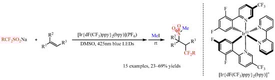 Fluoroalkanesulfinate salts ((RFSO2)nM), such as the Langlois reagent CF3SO2Na, could also be utilized as dual fluoroalkyl (RF) and sulfur dioxide (SO2) sources by the action of photoredox catalysis [39,40]. In 2020, Akita and co-workers [41] found that the Ir-complex [Ir{dF(CF3)ppy}2(bpy)](PF6) could promote the photoredox catalyzed fluoroalkyl-sulfonylation of alkenes with CF3SO2Na, (CF2HSO2)2Zn, MeCF2SO2Na, and 4-BrC6H4CH2CF2SO2Na as the radical precursors. Under visible light irradiation (425 nm), the reaction of fluoroalkanesulfinate salts with alkenes generated a trifluoromethyl-sulfonylated product, which could be transformed to a more stable methanesulfonylated product via the treatment of the reaction mixture with MeI (Scheme 15). Besides substituted styrenes, other alkenes including aliphatic alkenes, allylamine derivatives and pyridyl substituted alkenes were compatible with this present reaction, delivering the corresponding products in 23–69% yields.