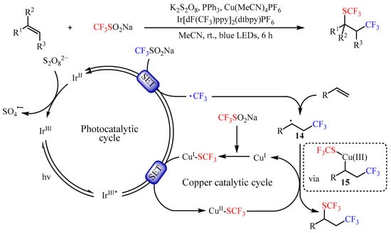 Shortly afterwards, Yi and co-workers [42] found that the same catalyst promoted the trifluoromethyl-thiotrifluoromethylation of alkenes by using CF3SO2Na as both CF3 and SCF3 source (Scheme 16). This photocatalysis strategy provided a facile method to a variety of vicinal trifluoromethylthio-trifluoromethylated compounds with 31–91% yields. In addition, an array of mechanistic investigations demonstrated that the reaction occurred through a photocatalyzed dual-oxidative process. Firstly, a long-lived triplet excited-state species IrIII* was generated through the SET pathway. Then, another SET between such species and CF3SO2Na resulted in the trifluoromethyl radical •CF3 and IrII species. The in situ-formed •CF3 radical then reacted with alkenes to generate a carbon-centered radical intermediate 14. Meanwhile, CuSCF3 could be generated in situ from CuI and CF3SO2Na with the assistance of PPh3, which was followed by oxidation to deliver a CuII species via SET. Subsequently, the intermediate 14 underwent single-electron oxidative addition to CuII-SCF3 to form species 15, a formally CuIII intermediate. Lastly, reductive elimination from intermediate 15 would yield the desired product by regenerating the corresponding CuI species.