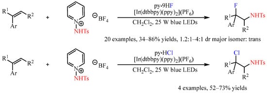 Recently, the N-Ts-protected 1-aminopyridine salt was developed as a N-radical progenitor in photoredox catalytic reactions [43]. The subjection of this compound to the mixture of olefins with a suitable nucleophilic reactant provided a chance for the construction of olefin-difunctionalized products. In this regard, Xu and co-workers [44] disclosed the Ir-catalyzed three-component aminofluorination or aminochlorination of styrenes with this shelf-stable nitrogen-radical precursor, and hydrogen fluoride-pyridine (py•9HF) or pyridine hydrochloride (py•HCl) as the nucleophilic halogen source. An array of styrenes were converted to the corresponding fluorosulfonamides or chlorosulfonamides in yields ranging from 34% to 86%, with the diastereoselectivities ranging from 1.2:1 to 4:1 in favor of the trans diastereomers (Scheme 17).