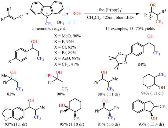 With Umemoto’s reagent as the trifluoromethylating reagent, Akita and co-workers [45] accomplished the three-component intermolecular oxytrifluoromethylation of alkenes with oxygenic nucleophiles. The introduction of a CF3 group and various oxygenic functional groups, including hydroxy, alkoxy, as well as carboxy groups, to C=C bonds has been realized by employing fac-Ir(ppy)3 as the photoredox catalysis under irradiation with blue LEDs or sunlight (Scheme 18) [46]. Notably, this reaction could be applied to styrenes with halogen atoms or ester groups, such as AcO and Bpin. For internal alkenes, the reaction occurred smoothly, with the diastereoselectivity ranging from 1:1 to 1:10. Notably, the electron-rich alkene 3,4-dihydro-2H-pyran also provided a suitable substrate in this photocatalytic system.