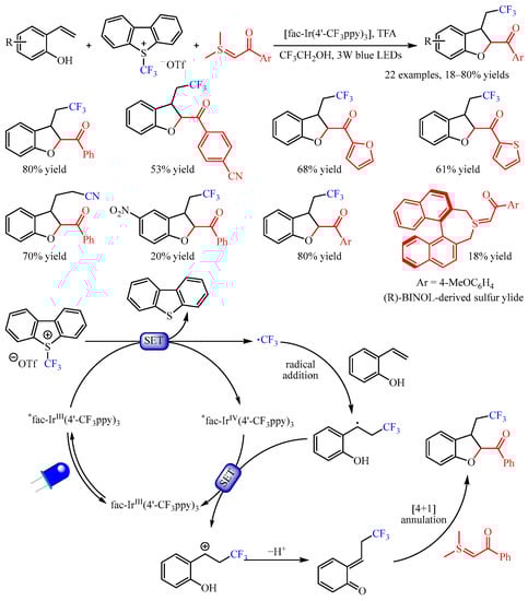 Xiao and co-workers [47] found that the exposure of 2-vinylphenols to the mixture of Umemoto’s reagent and sulfur ylides under photoredox catalysis with fac-Ir(4′-CF3ppy)3 enabled a multicomponent cyclization reaction, providing access to trifluoromethylated 2,3-dihydrobenzofurans (Scheme 19). The substrate scope of sulfur ylides proved to be broad, and substrates bearing furan- and thiophene- substituents were amenable. Importantly, the sulfonium bromide could be used directly, producing the desired product with good yield. The reaction with 2-vinyl phenols bearing several functional groups such as halogen and nitro groups worked well to furnish the vinyl difunctionalized products. Interestingly, the cyanoalkylated 2,3-dihydrobenzofuran could be obtained in a 70% yield, when using iodoacetonitrile instead of Umemoto’s reagent as the radical source and Ru(bpy)3Cl2•6H2O as the photocatalyst. Notably, the use of (R)-BINOL-derived sulfur ylide under standard conditions resulted in the corresponding product in an 18% yield with 25% ee. On the basis of the mechanistic studies, the author proposed a plausible mechanism. First, the relatively stable benzyl radical was generated through the SET process, which was followed by further oxidization by the oxidizing state IrIV via the SET process, forming a benzylic cation. Subsequently, this benzylic cation intermediate underwent deprotonation to produce a reactive o-QM intermediate, which participated in a formal [4+1] annulation with the sulfur ylide to obtain the desired product.