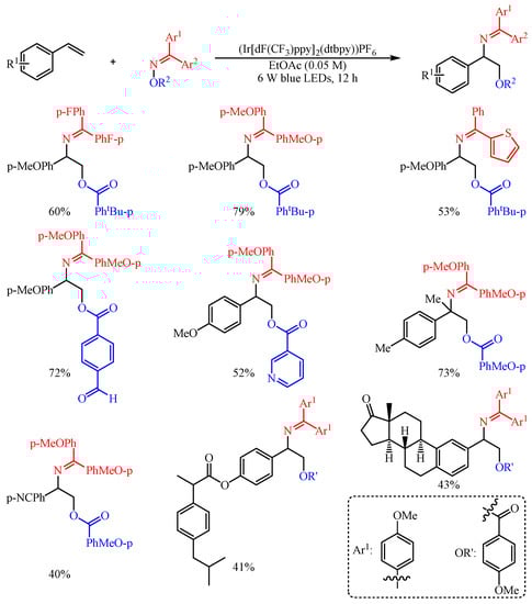 Huo and co-workers [50] found that the aromatic carboxylic acid oxime esters could be employed as bifunctional agents for the difunctionalization of aryl alkenes with (Ir[dF(CF3)ppy]2(dtbpy))PF6 as the catalyst (Scheme 21). Both O-centered radicals and N-centered radicals were generated in the meantime through the photosensitized Energy Transfer Catalysis (EnT) strategy-promoted O–N bond homolysis event [51]. With this strategy, a series of complex vicinal amino alcohols were facilely fabricated in one-step synthesis through the EnT-promoted 1,2-bifunctionalization of alkenes to decorate both C–N and C–O bonds synchronously. The substrate scope of this reaction proved to be broad, and an array of oxyaminated products were constructed in 40–79% yield. In addition, the synthetic utility of this transformation was further extended to the late-stage modification of complicated alkenes, such as the functionalization of several drug-related molecules and bioactive natural products.