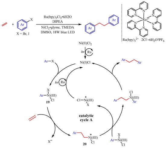 In 2019, Wu and co-workers [52] found that the photo-catalytic 1,2-difunctionalization of ethylene could be achieved by the incorporation of Ru-photoredox catalysis and Ni-catalysis sequences (Scheme 22). With a catalytic amount of Ru(bpy)3Cl2•6H2O and NiCl2•glyme, various 1,2-diarylethanes could be furnished in 55–91% yields. Mechanistic studies demonstrated that this reaction was initiated by Ru-promoted Ni(I) formation under visible light irradiation. Subsequently, the aryl-Ni(III) species 19 was formed through the oxidative addition of Ni(I) with aryl halides, which was followed by the migration insertion of ethylene into the intermediate 19 along with the halide dissociation event, delivering a cationic alkyl Ni-species 20. Subsequently, the transmetallation between 20 and the aryl-Ni(III) species 19 occurred, and gave an aryl alkyl Ni(III) intermediate, which further caused a reductive elimination event, producing the desired product with the formation of the active catalyst Ni(I) species. Notably, the transmetallation between 20 and the aryl-Ni(III) species 19 would also give a cationic Ni(III) intermediate, which could be reduced and regenerate the reactive Ni(I) species through the SET [53].