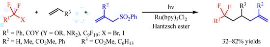 For the synthesis of CF2-containing compounds, Ryu’s group [54] developed the Ru-catalyzed difunctionalization of 1-octene and methyl acrylate with α-gem-difluorinated halides and allyl sulfones as the coupling partners under visible light irradiation (Scheme 23). With this strategy—the subjection of a catalytic amount of Ru(bpy)3Cl2 to the mixture of Hantzsch ester (HEH), terminal alkenes and diisopropylethylamine—the difunctionalization reaction was finished within 2 h to give the corresponding 6,6-difluoroalkenes in 32–82% yields. The HEH and/or amine served as the reductant to activate the Ru(II) catalyst, and facilitated the generation of difluoroalkyl radicals from gem-difluorinated halides [55].