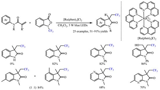 With Togni’s reagent as the radical precursor, the intramolecular trifluoromethylation/arylation of N-aryl acrylamides could also be accomplished by Ru-photoredox catalyst [Ru(phen)3]Cl2 (Scheme 24) [56,57]. Under visible light irradiation, an array of CF3-containing oxindoles with a quaternary carbon center was obtained in 51–91% yields. However, the use of a secondary aryl amide failed to produce the desired product, and the regioselectivity was poor for aryl meso-substituted N-aryl acrylamides.