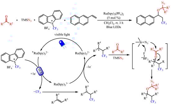 In 2019, Masson [58] developed an efficient four-component photoredox-catalyzed azidoalkoxy-trifluoromethylation reaction by employing [Ru(bpy)3(PF6)2] as the catalyst in the presence of Umemoto’s reagent, a carbonyl compound, and TMSN3. With the irradiation of blue LEDs, a variety of carbonyl compounds could be coupled with various terminal or internal alkenes to obtain several structurally diverse trifluoromethylated products with up to 77% yield. For the internal alkenes, the diastereomeric ratios ranged from 52:48 to 92:8. In addition, the TMSCN reagent could be introduced instead of TMSN3, and this generated the corresponding cyanoalkoxy-trifluoromethylation product at a moderate yield. A plausible reaction mechanism has been proposed and outlined in Scheme 25. Initially, the SET process generated a reactive •CF3 from Umemoto’s reagent, which was followed by the regioselective addition of electrophilic •CF3 to alkenes and formed the carbon-centered radical species. Subsequently, this carbon-centered radical species was oxidized into a carbon cation intermediate by SET from Ru(bpy)33+. Finally, the corresponding cation intermediate was trapped by the TMSN3-induced nucleophilic attack of the carbonyl compound tandem, coupling with the assistance of tetrafluoroborate counteranion to produce the desired product, and this finished the catalytic cycle.