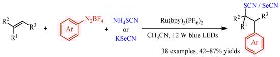 By employing aryl diazonium salts as the radical precursor, and ammonium thiocyanate or potassium selenocyanate as the nucleophilic reagent, Maity and co-workers [59,60] achieved the intermolecular arylthiocyanation/arylselenocyanation of alkenes under the irradiation of visible light (Scheme 26). Both terminal and internal alkenes were accommodated in this protocol. Several functional groups, including ester, benzyl chloride, acrylate, and nitryl, were tolerated in 42–87% yields. For conjugated dienes, the reaction occurred regioselectively at the terminal double bond. However, alkyl-substituted alkenes failed to deliver the desired products.