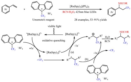 The Ru-photoredox catalysis intermolecular aminotrifluoromethylation of alkenes with Umemoto’s reagent was developed by Akita and co-workers [61]. This photocatalytic strategy enabled a robust one-step facial route to various valuable 1,1,1-trifluoro-3-acetylaminopropane derivatives. This reaction featured a broad substrate scope with 28 examples in 53–91% yield. A plausible reaction mechanism is shown in Scheme 27. First, the •CF3 was generated via the SET processes, which was followed by the addition of •CF3 to the C=C bond of alkenes to give the corresponding carbon-centered radical intermediate. This intermediate could be oxidized to carbon cations by [Ru(bpy)3]3+ through the SET event (path a). Additionally, this cation intermediate would also be furnished through the radical propagation process (path b). Lastly, this intermediate underwent the further attack process with RCN and hydrolysis with water sequences (Ritter type amination), affording the desired aminotrifluoromethylated products [62].