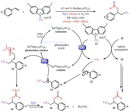 In 2019, She and co-workers [63] developed a four-component intermolecular trifluoromethylation-acyloxylation of arylalkenes with Ru(bpy)3(PF6)2 as the photoredox catalyst under mild reaction conditions (Scheme 28). In this protocol, a new Umemoto’s reagent was developed and employed as the trifluoromethyl radical source to facilitate the difunctionalization of styrenes. Under optimized conditions, this photoredox reaction exhibits good functional group tolerance for aryl olefins, with yields up to 91%. Based on control, deuterium and O18-labeling experiments, the authors proposed a conceivable mechanism involving an acyloxyl process, with the mixture of N,N-dimethylformamide (DMF)/N,N-dimethylacetamide (DMAc) with H2O as the acyloxyl source. First, the reaction formed a reactive RuII(bpy)3(PF6)2 species under irradiation with white LEDs, which was followed by the single-electron reduction of 21 to generate the electrophilic •CF3 radical. The following combination with arylalkene 22 generated the stable benzyl radical 23, which was further oxidized by the reactive Ru(III) species to deliver the corresponding benzyl carbocation 24 via another SET event. This intermediate 24 was then trapped by the nucleophilic attack with DMF or DMAc to produce the imine intermediate 25, which was hydrolyzed, yielding the desired difunctionalized product 26.