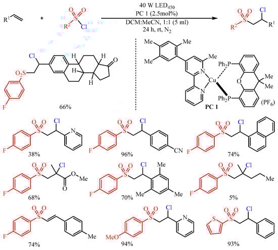 - Alkan-Zambada, M.; Hu, X. Cu-Catalyzed Photoredox Chlorosulfonation of Alkenes and Alkynes. J. Org. Chem. 2019, 84, 4525–4533. [Google Scholar] [CrossRef]