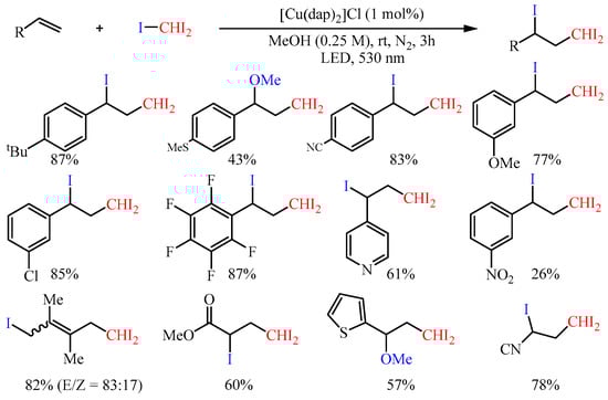 - Engl, S.; Reiser, O. Copper Makes the Difference: Visible Light-Mediated Atom Transfer Radical Addition Reactions of Iodoform with Olefins. ACS Catal. 2020, 10, 9899–9906. [Google Scholar] [CrossRef]