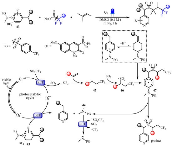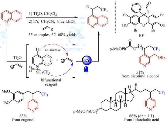 - Lee, K.; Lee, S.; Kim, N.; Kim, S.; Hong, S. Visible-Light-Enabled Trifluoromethylative Pyridylation of Alkenes from Pyridines and Triflic Anhydride. Angew. Chem. Int. Ed. 2020, 59, 13379–13384. [Google Scholar] [CrossRef] [PubMed]