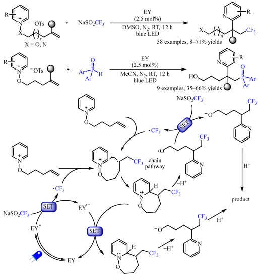 - Jeon, J.; He, Y.T.; Shin, S.; Hong, S. Visible-Light-Induced ortho-Selective Migration on Pyridyl Ring: Trifluoromethylative Pyridylation of Unactivated Alkenes. Angew. Chem. Int. Ed. 2020, 59, 281–285. [Google Scholar] [CrossRef]