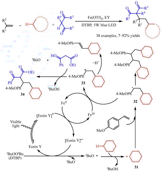 - Ouyang, X.H.; Li, Y.; Song, R.J.; Hu, M.; Luo, S.L.; Li, J.H. Intermolecular dialkylation of alkenes with two distinct C(sp(3))-H bonds enabled by synergistic photoredox catalysis and iron catalysis. Sci. Adv. 2019, 5, eaav9839. [Google Scholar] [CrossRef] [PubMed]