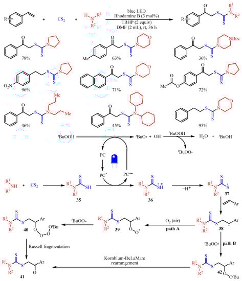 - Vishwakarma, R.K.; Kumar, S.; Singh, K.N. Visible-Light-Induced Photocatalytic Synthesis of β-Keto Dithiocarbamates via Difunctionalization of Styrenes. Org. Lett. 2021, 23, 4147–4151. [Google Scholar] [CrossRef] [PubMed]