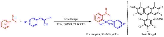 - Xin, J.R.; Guo, J.T.; Vigliaturo, D.; He, Y.H.; Guan, Z. Metal-free visible light driven synthesis of tetrahydroquinoline derivatives utilizing Rose Bengal. Tetrahedron 2017, 73, 4627–4633. [Google Scholar] [CrossRef]