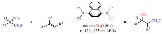 - Noto, N.; Koike, T.; Akita, M. Visible-Light-Triggered Monofluoromethylation of Alkenes by Strongly Reducing 1,4-Bis(diphenylamino)naphthalene Photoredox Catalysis. ACS Catal. 2019, 9, 4382–4387. [Google Scholar] [CrossRef]