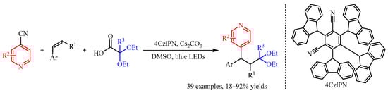 - Ma, C.H.; Ji, Y.; Zhao, J.; He, X.; Zhang, S.T.; Jiang, Y.Q.; Yu, B. Transition-metal-free three-component acetalation-pyridylation of alkenes via photoredox catalysis. Chin. J. Catal. 2022, 43, 571–583. [Google Scholar] [CrossRef]