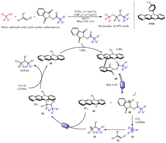 - Shibutani, S.; Nagao, K.; Ohmiya, H. Organophotoredox-Catalyzed Three-Component Coupling of Heteroatom Nucleophiles, Alkenes, and Aliphatic Redox Active Esters. Org. Lett. 2021, 23, 1798–1803. [Google Scholar] [CrossRef]