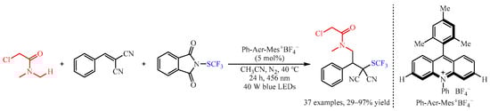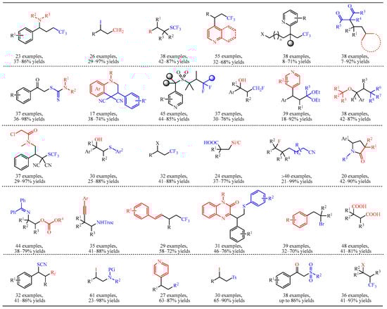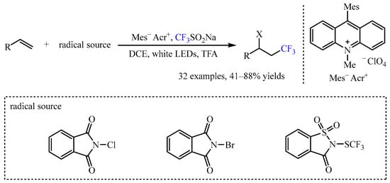 - Fang, J.; Wang, Z.K.; Wu, S.W.; Shen, W.G.; Ao, G.Z.; Liu, F. Photoredox-catalysed chloro-, bromo- and trifluoromethylthio-trifluoromethylation of unactivated alkenes with sodium triflinate. Chem. Commun. 2017, 53, 7638–7641. [Google Scholar] [CrossRef]