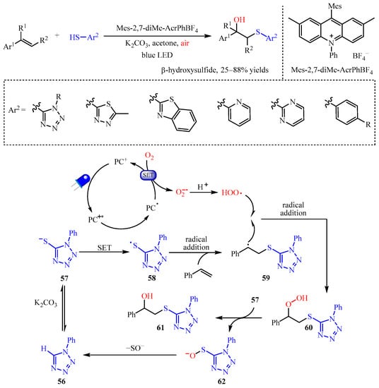 - Hong, J.E.; Jung, Y.; Min, D.; Jang, M.; Kim, S.; Park, J.; Park, Y. Visible-Light-Induced Organophotocatalytic Difunctionallization: Open-Air Hydroxysulfurization of Aryl Alkenes with Aryl Thiols. J. Org. Chem. 2022, 87, 7378–7391. [Google Scholar] [CrossRef]