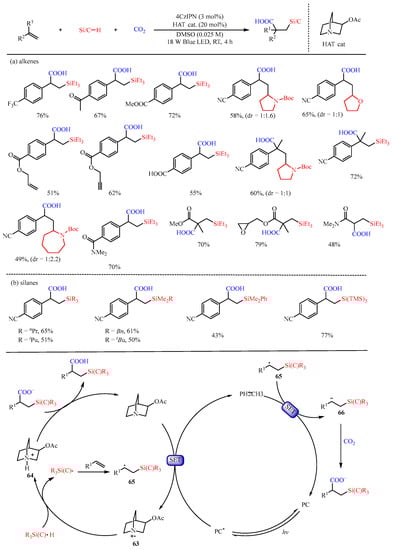 - Hou, J.; Ee, A.; Cao, H.; Ong, H.W.; Xu, J.H.; Wu, J. Visible-Light-Mediated Metal-Free Difunctionalization of Alkenes with CO2 and Silanes or C(sp(3))-H Alkanes. Angew. Chem. Inter. Ed. 2018, 57, 17220–17224. [Google Scholar] [CrossRef]