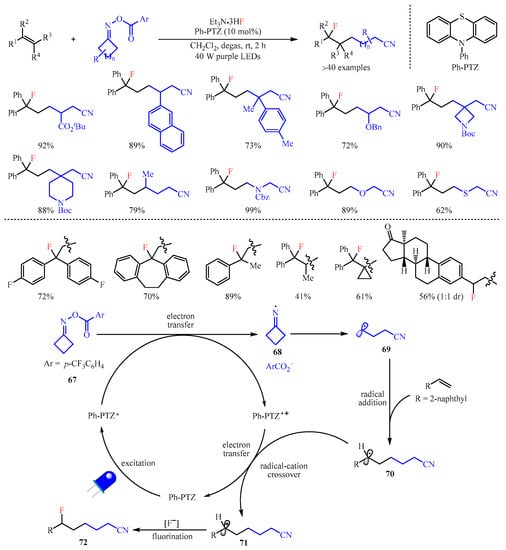 - Qian, H.; Chen, J.; Zhang, B.; Cheng, Y.; Xiao, W.J.; Chen, J.R. Visible-Light-Driven Photoredox-Catalyzed Three-Component Radical Cyanoalkylfluorination of Alkenes with Oxime Esters and a Fluoride Ion. Org. Lett. 2021, 23, 6987–6992. [Google Scholar] [CrossRef]