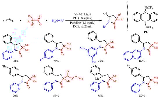- Klauck, F.J.R.; Yoon, H.; James, M.J.; Lautens, M.; Glorius, F. Visible-Light-Mediated Deaminative Three-Component Dicarbofunctionalization of Styrenes with Benzylic Radicals. ACS Catal. 2019, 9, 236–241. [Google Scholar] [CrossRef]