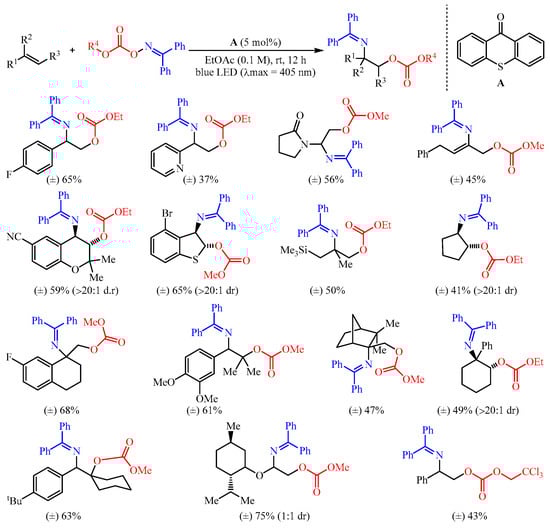 - Hu, X.Q.; Chen, J.; Chen, J.R.; Yan, D.M.; Xiao, W.J. Organophotocatalytic Generation of N- and O-Centred Radicals Enables Aerobic Oxyamination and Dioxygenation of Alkenes. Chem. Eur. J. 2016, 22, 14141–14146. [Google Scholar] [CrossRef]