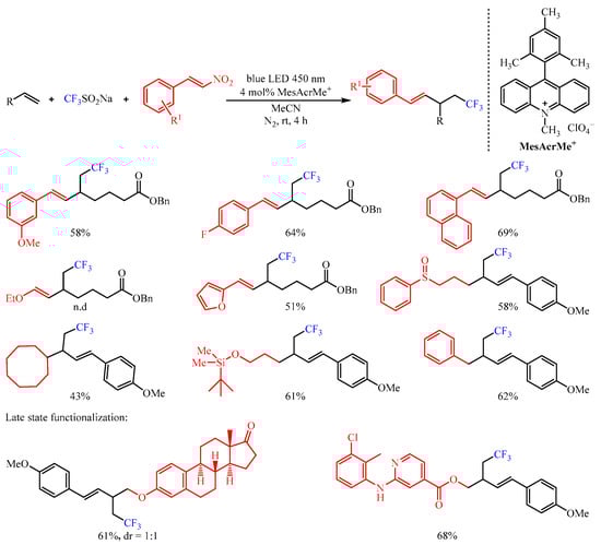- Kulthe, A.D.; Mainkar, P.S.; Akondi, S.M. Intermolecular trifluoromethyl-alkenylation of alkenes enabled by metal-free photoredox catalysis. Chem. Commun. 2021, 57, 5582–5585. [Google Scholar] [CrossRef] [PubMed]