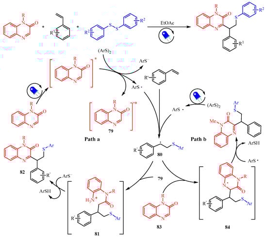 - Singh, S.; Dagar, N.; Pal, G.; Roy, S.R. Photoinduced radical cascade reactions for the thioalkylation of quinoxalin-2(1H)-ones: An access to beta-heteroaryl thioethers under metal- and catalyst-free conditions. Green Chem. 2022, 24, 8460–8465. [Google Scholar] [CrossRef]