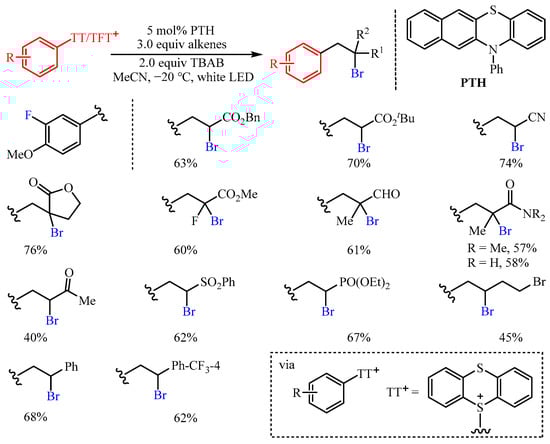 - Cai, Y.; Ritter, T. Meerwein-type Bromoarylation with Arylthianthrenium Salts. Angew. Chem. Inter. Ed. 2022, 61, e202209882. [Google Scholar] [CrossRef]