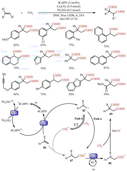 - Ju, T.; Zhou, Y.Q.; Cao, K.G.; Fu, Q.; Ye, J.H.; Sun, G.Q.; Liu, X.F.; Chen, L.; Liao, L.L.; Yu, D.G. Dicarboxylation of alkenes, allenes and (hetero)arenes with CO2 via visible-light photoredox catalysis. Nat. Catal. 2021, 4, 304–311. [Google Scholar] [CrossRef]