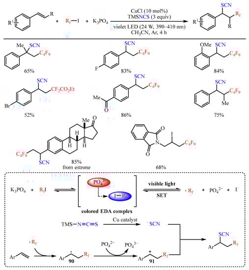 - Li, Z.B.; Wang, S.; Huo, Y.M.; Wang, B.; Yan, J.; Guo, Q.P. Visible light-driven fluoroalkylthiocyanation of alkenes via electron donor-acceptor complexes. Org. Chem. Front. 2021, 8, 3076–3081. [Google Scholar] [CrossRef]
