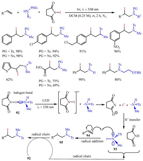 - Engl, S.; Reiser, O. Catalyst-Free Visible-Light-Mediated Iodoamination of Olefins and Synthetic Applications. Org. Lett. 2021, 23, 5581–5586. [Google Scholar] [CrossRef]